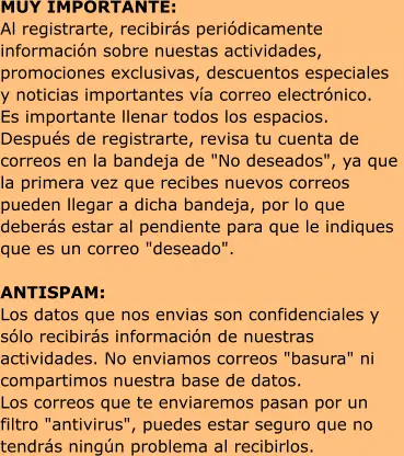 MUY IMPORTANTE:Al registrarte, recibirás periódicamente información sobre nuestas actividades, promociones exclusivas, descuentos especiales y noticias importantes vía correo electrónico. Es importante llenar todos los espacios. Después de registrarte, revisa tu cuenta de correos en la bandeja de "No deseados", ya que la primera vez que recibes nuevos correos pueden llegar a dicha bandeja, por lo que deberás estar al pendiente para que le indiques que es un correo "deseado".ANTISPAM:Los datos que nos envias son confidenciales y sólo recibirás información de nuestras actividades. No enviamos correos "basura" ni compartimos nuestra base de datos.Los correos que te enviaremos pasan por un filtro "antivirus", puedes estar seguro que no tendrás ningún problema al recibirlos.